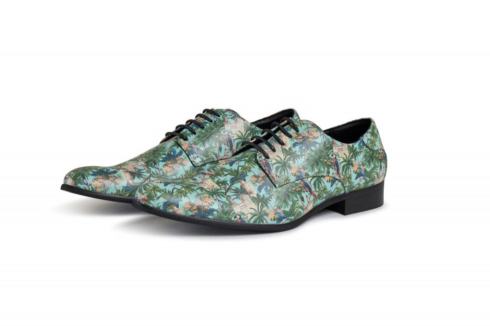 Trek de aandacht met de Lureaux "City Jungle" herenschoenen. Deze unieke schoenen hebben een kleurrijk tropisch patroon met groene palmbomen, exotische bloemen en historische gebouwen op een groene achtergrond. Perfect voor wie houdt van een opvallende en avontuurlijke stijl.
